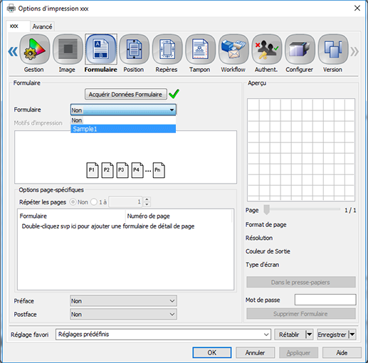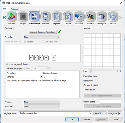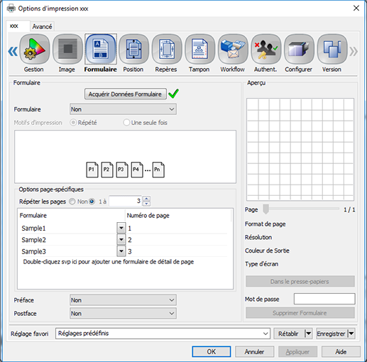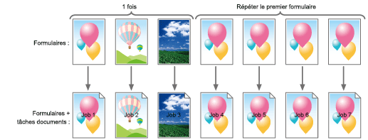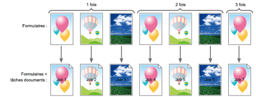 • Explication supplémentaireUne seule fois : superpose un formulaire sur les pages d'une tâche une seule fois pour réaliser les impressions.