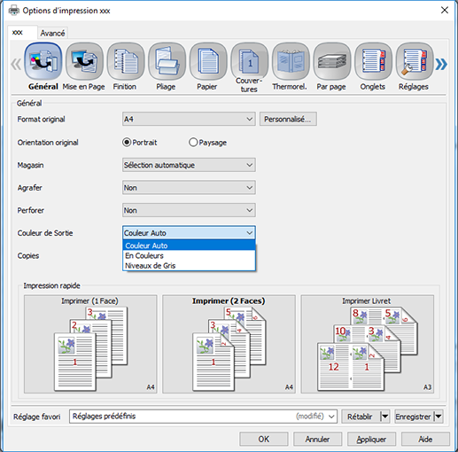 Pour en savoir plus sur le réglage du pilote d'imprimante, voir Écran [Général] ou Fenêtre [Options avancées].