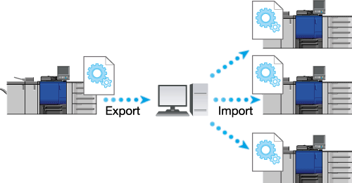 Divers réglages de cette machine peuvent être enregistrés (exportés) vers un ordinateur. Cet écran est disponible quand vous voulez sauvegarder divers réglages de cette machine ou appliquer le même réglage à plusieurs périphériques.