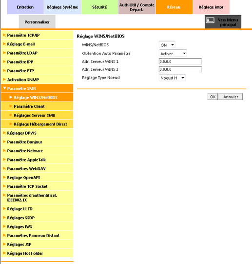 Pour afficher cet écran, cliquez sur Configuration SMB - Configuration WINS/NetBIOS dans le menu de l'onglet Réseau.