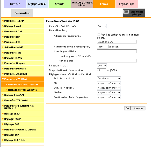 Cliquez sur Configuration WebDAV - Paramètres Client WebDAV dans le menu de l'onglet Réseau pour afficher cet écran.