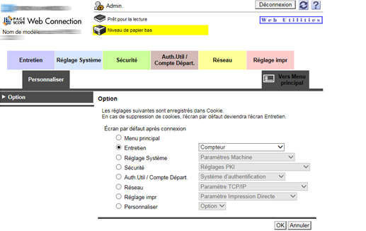 Cet écran permet de spécifier l'écran affiché en premier après la connexion en mode administrateur à PageScope Web Connection.