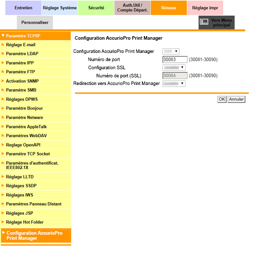 Pour afficher cet écran, cliquez sur Configuration AccurioPro Print Manager dans le menu de l'onglet Réseau.
