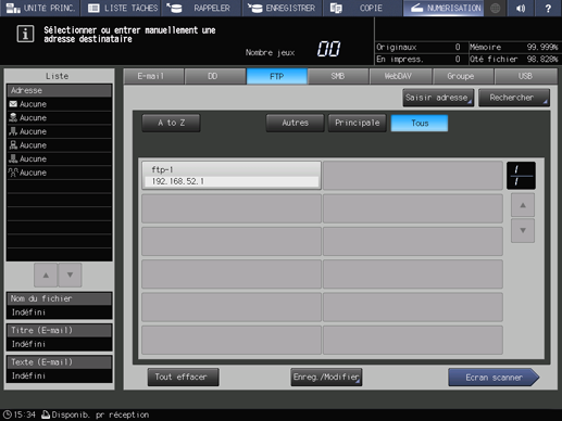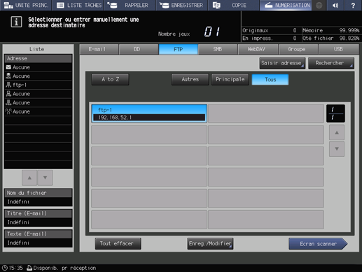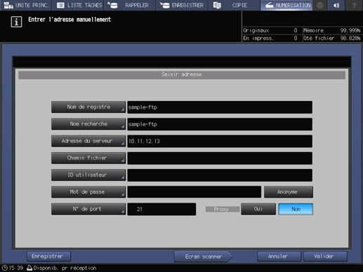 Explication supplémentairePour sélectionner une adresse enregistrée, voir Utilisation du serveur FTP enregistré.