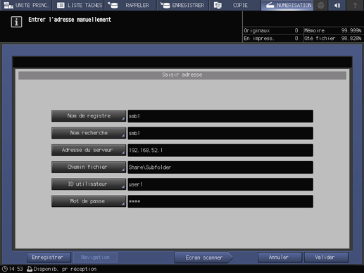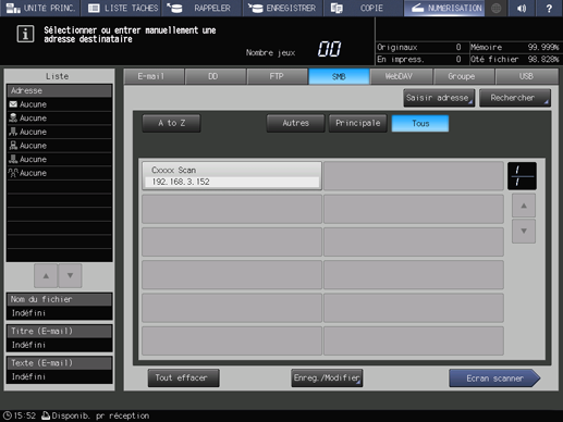 Explication supplémentairePour en savoir plus sur la sélection d'une adresse enregistrée, voir Utilisation du serveur SMB enregistré.