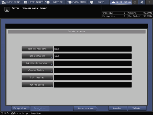 Explication supplémentairePour sélectionner une adresse enregistrée, voir Utilisation du serveur SMB enregistré.