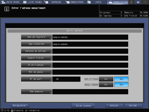 Explication supplémentairePour sélectionner une adresse enregistrée, voir Utilisation du serveur WebDAV enregistré.