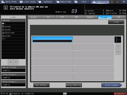 Explication supplémentairePour modifier les adresses à enregistrer dans un groupe, appuyez sur Modifier sur l'écran Liste adresses Groupe.