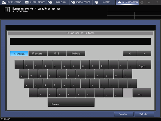 • Explication supplémentaireAppuyez sur Valider pour revenir à l'écran Mode programmes utilisateur. Le bouton de la tâche affiche le nome de tâche saisi.