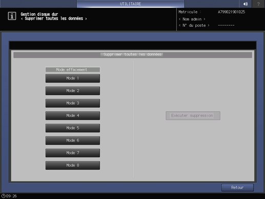 Sélectionnez le mode d'effacement à utiliser pour la suppression de toutes les données du disque dur ou de la mémoire non volatile de la machine. Procédez à la suppression de toutes les données. Utilisez cette fonction en cas de cession de la machine.