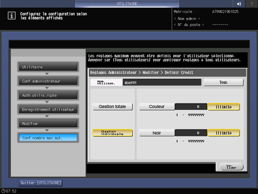 Explication supplémentaireAppuyez sur Définir limite max. pour afficher l'écran Définir limite max. Entrez la limite maximum au clavier. Si vous appuyez sur Illimité, la valeur est réinitialisée et la limite maximum n'est pas définie. Sélectionnez Tous utilisateurs pour appliquer les paramètres actuels à tous les utilisateurs.