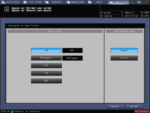 Sélectionnez PDF dans Type fichier et Paquet ou Divisé dans Configuration pages. Appuyez ensuite sur OK.