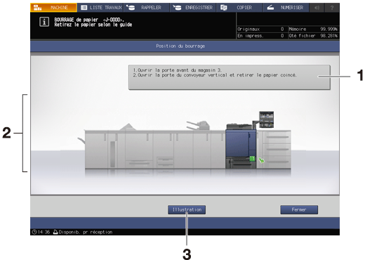 1 | Zone des messages | Explique avec du texte le procédé de retrait du papier coincé, conformément aux illustrations jointes. |