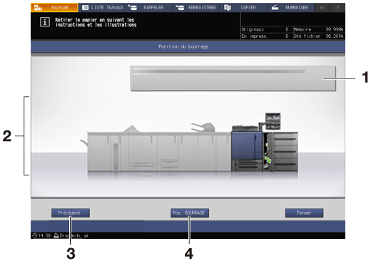 1 | Zone des messages | Des instructions détaillées concernant l'enlèvement du papier s'affiche. |