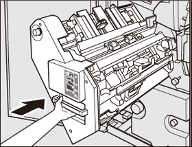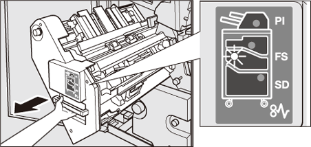 Attrapez la poignée [FS9] pour remettre l'empileur à sa position d'origine et refermez la porte avant de l'unité de finition.