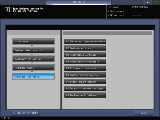 2. Appuyez sur Configuration système dans le Menu Réglage administrateur et appuyez consécutivement sur Réglages expert, Réglages imprimante et Effacement bord avant.