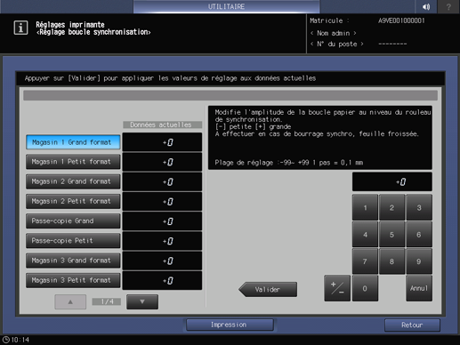 Appuyez sur Configuration système dans le Menu Réglage administrateur et appuyez consécutivement sur Réglages expert, Réglages imprimante et Boucle rouleau synchro.