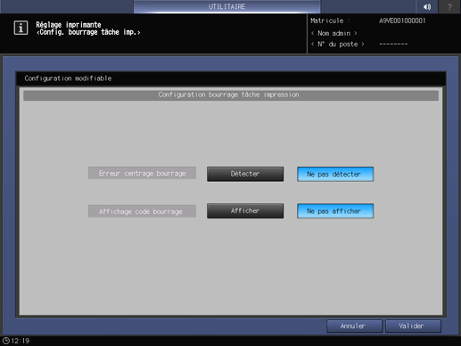 Appuyez sur Configuration système dans le menu Réglage administrateur et appuyez consécutivement sur Réglages expert, Réglages imprimante et Conf. bourrage tâche imp.