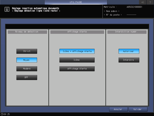 Définissez le niveau de détection des lignes blanches sur recto 1, l'affichage d'alertes et s'il faut arrêter la numérisation de l'original dans le chargeur ADF.