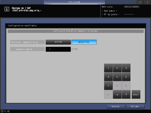 2. Appuyez sur l'ongletConfiguration système de l'écran menu Réglage administrateur et appuyez consécutivement sur Réglages expert, Réglage ADF et Config. pré-élév. mag. orig.