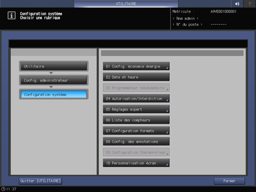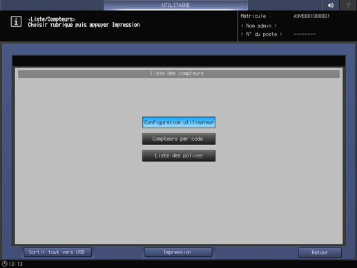 Appuyez sur l'onglet Configuration système de l'écran Menu Réglage administrateur et appuyez sur Liste des compteurs.