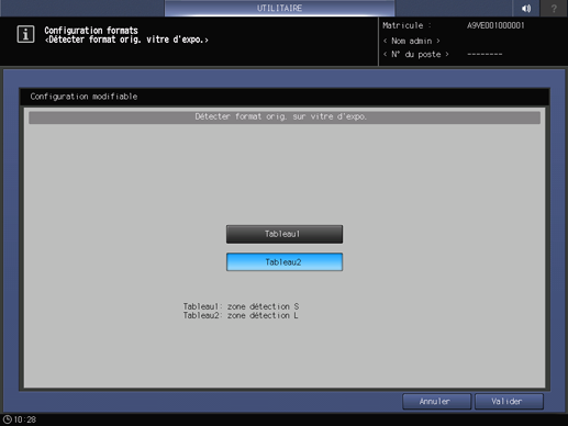 Appuyez sur l'onglet Configuration système de l'écran Menu Configuration administrateur et appuyez consécutivement sur Format et Détect format orig.sur vitre.