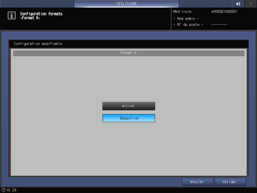 Appuyez sur l'onglet Configuration système de l'écran Menu Réglage administrateur et appuyez consécutivement sur Paramétrage formats et Format K.