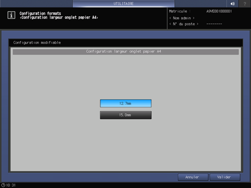Appuyez sur l'onglet Configuration système de l'écran Menu Réglage administrateur et appuyez consécutivement sur Paramétrage formats et Para. larg. onglet pap. onglet A4.