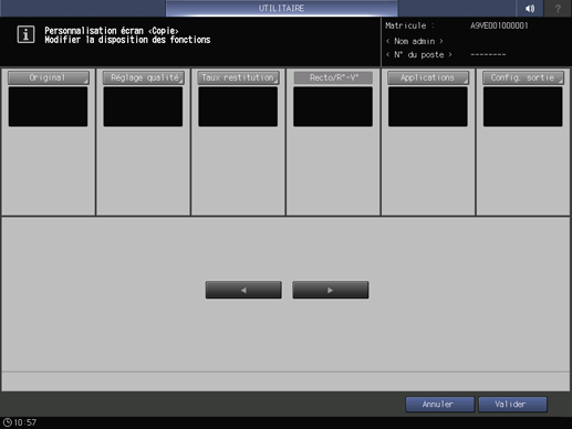 Appuyez sur l'onglet Configuration système de l'écran Menu Réglage administrateur et appuyez consécutivement sur Personnalisation écran et Personnalisation écran copie.