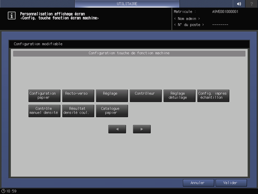 Appuyez consécutivement sur Configuration système sur l'écran Menu configuration administrateur et appuyez sur Personnalisation écran et Configuration touche de fonction machine.