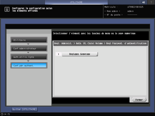 Appuyez successivement sur Auth. utilis./Compte Département, Config .périph .authent. et Configuration générale sur l'écran Menu Config. administrateur.
