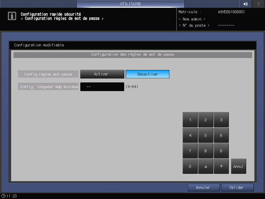 Ce réglage est le même que celui de Conf.sécu.rapide - Configuration des règles de mot de passe accessible de l'écran UTILITAIRE.