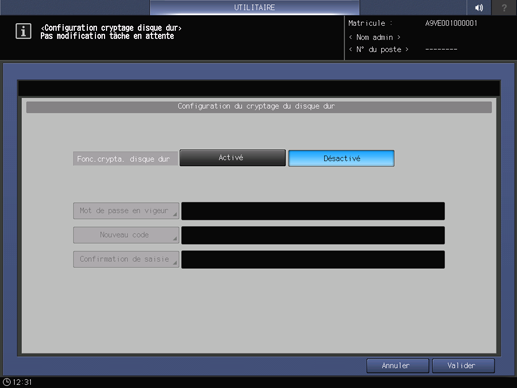 La configuration du cryptage du disque dur ne peut être modifiée que lorsque qu'aucune tâche (tâche en attente, tâches DD, tâche sécurisée) n'est enregistrée sur le disque dur.