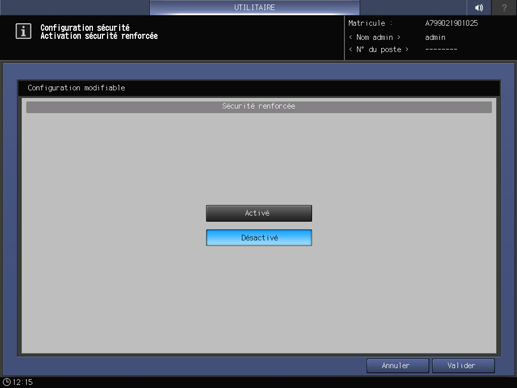 • Pour activer le mode Sécurité renforcée, le technicien S.A.V. doit définir sur la machine un code d'identification technicien et un code pour l'administrateur. Ensuite, dans l'écran UTILITAIRE, accédez à Conf. administrateur - Configuration sécurité - Configu.gest. de disque dur - Configuration du cryptage du disque dur et sélectionnez Activé.