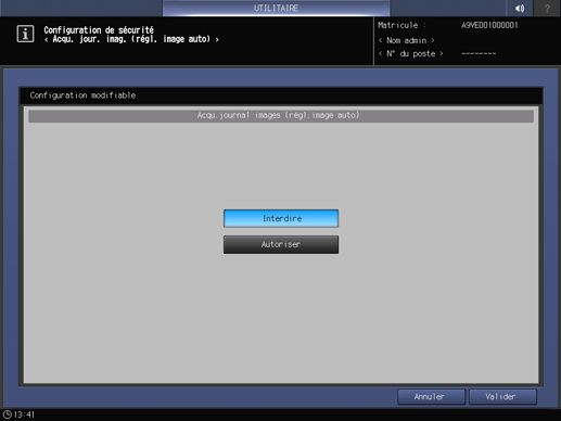 Afin de prévenir l'acquisition de journaux par le technicien SAV sans votre autorisation, cette fonction est réglée sur Interdire par défaut. L'acquisition de journaux n'est possible que si Autoriser est sélectionné.