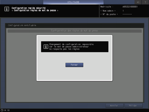 Explication supplémentaireSi vous appuyez sur Activer alors que le mot de passe administrateur reste inchangé, le mot de passe administrateur ne respecte pas les règles, ou qu'un mot de passe comportant plus de caractères que le nombre de caractères défini pour le mot de passe administrateur est entré dans Définir longueur minimum mot passe, une boîte de dialogue s'affiche pour indiquer que la sélection a été rejetée. Entrez un nouveau mot de passe conforme aux règles ou entrez un mot de passe contenant le nombre correct de caractères défini pour le mot de passe administrateur. Pour des détails, voir [Mot de passe admin.].