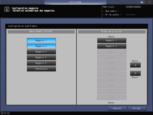 Sélectionnez le magasin d'alimentation papier quand la fonction APS est activée et le magasin de remplacement quand la fonction Changement automatique des magasins (ATS est activée. Les magasins ne peuvent pas être sélectionnés séparément.