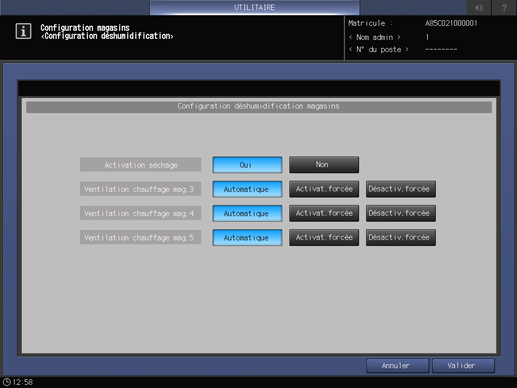 Si l'unité grande capacité Unit LU-202m ou l'unité grande capacité LU-202XL est dotée du déshumidificateur HT-503, si l'unité d'alimentation papier PF-602 est dotée du déshumidificateur HT-504 ou du déshumidificateur HT-505, ou si l'unité d'alimentation papier PF-707m est dotée du déshumidificateur HT-506, définissez l'option d'activation séchage et l'option d'activation automatique/forcée d'air chaud pour chaque magasin.