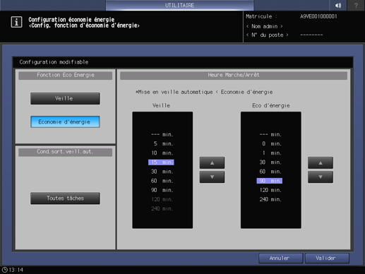 Appuyez consécutivement sur Configuration système sur l'écran Menu Réglage utilisateur et appuyez sur Réglage économie énergie et Réglage fonc. éco. éner.