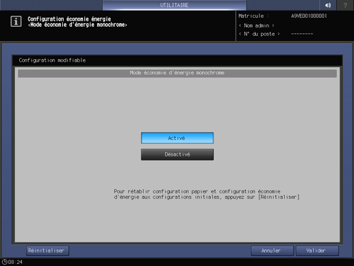 Appuyez consécutivement sur Configuration système sur l'écran Menu Configuration utilisateur et appuyez sur Réglage économie énergie et Eco énergie monochrome.