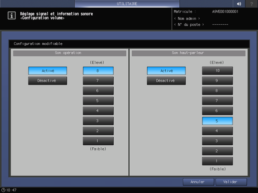 • Explication supplémentairePour activer le son opération des touches, appuyez sur Activé et sélectionnez le volume qui convient.