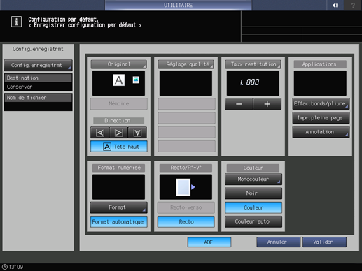 Vous pouvez définir les réglages par défaut de l'écran ENREGISTRER en cas de réinitialisation de la machine. Pour activer ce réglage, sélectionnez Initialiser pour la Fonction touche Auto de Autres configurations.