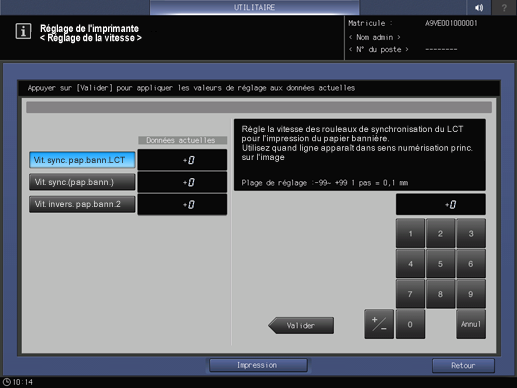 Vit. invers. pap.bann.1 | Réglez la vitesse inverse des rouleaux de papier bannière. Cette option est utilisée en cas de bourrages papier. | Plage de réglage : -200 - +200 1 pas = 0,01 % [+] Rapide[-] Lent |
