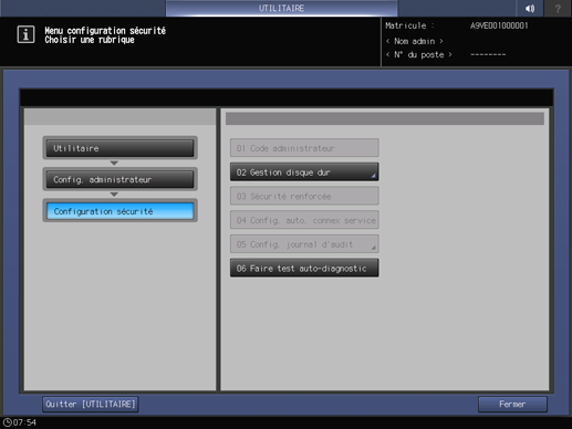 Sur l'écran Menu config. administrateur, appuyez successivement sur Configuration sécurité et Exécuter test d'auto-diagnostic.