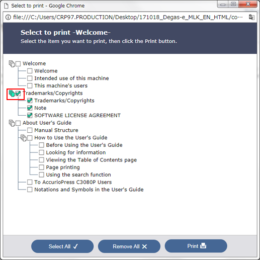 Un clic sur le bouton Sélectionner et imprimer en haut et à droite de l'écran affiche les pages sélectionnées en les cochant dans la table des matières.