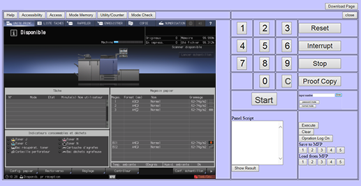 La configuration du panneau distant en temps réel active le contrôle à distance en utilisant la mise à jour de l'écran en temps réel. Comme avec le panneau distant, le panneau distant en temps réel peut interdire toute utilisation de la machine depuis l'écran tactile et le panneau de contrôle (verrouillage du panneau principal). Quand cette fonction est activée, l'écran tactile de la machine s'éteint et ne vous permet pas de contrôler les opérations exécutées sur le panneau distant en temps réel.
