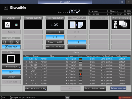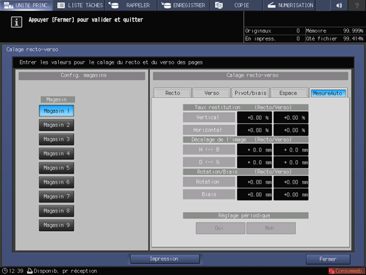 Appuyez sur MesureAuto, puis sur impression, après sélection du magasin chargé du papier à régler.