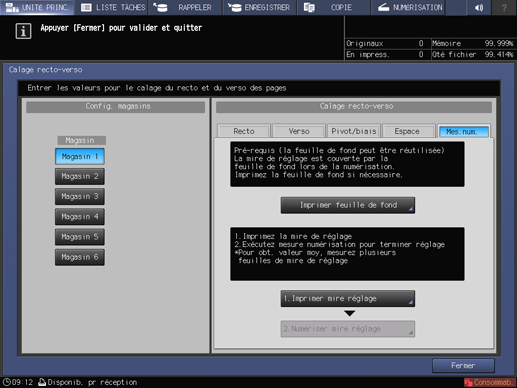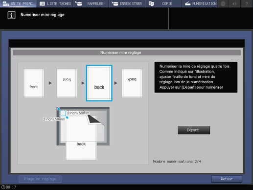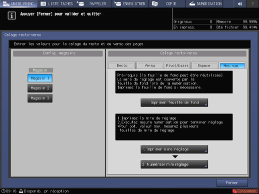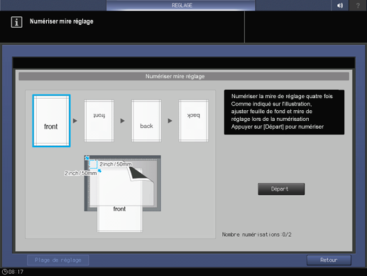 • Le réglage Mes.num. est une méthode simple permettant de régler uniquement le taux de restitution et la position de l'image sur le côté verso. Pour effectuer des réglages, y compris au recto, suivez la procédure décrite dans Réglage [MesureAuto], [Mire réglage] ou Réglage taux [Taux restitution]/[décalage image].