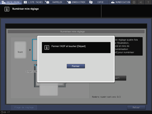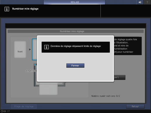 • Explication supplémentaireSi la valeur de réglage calculée en appuyant sur Oui est en dehors de la plage de réglage, le dialogue suivant s'affiche. Appuyez sur Fermer pour ignorer les résultats de mesure et relancer la mesure de numérisation depuis le début.