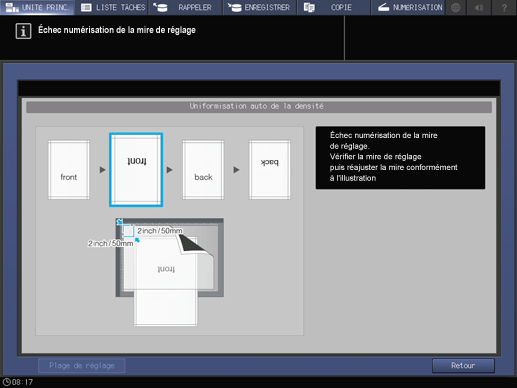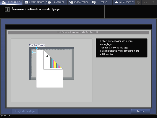• Explication supplémentaireLe message Echec numérisation mire réglage est peut-être affiché. Suivez les instructions à l'écran pour placer correctement la mire de réglage et la feuille de fond avant d'appuyer sur Fermer.